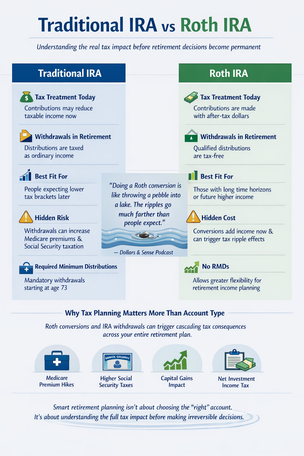 “Doing a Roth conversion is like throwing a pebble into a lake. You see the ripples, and they travel much farther than people expect.”